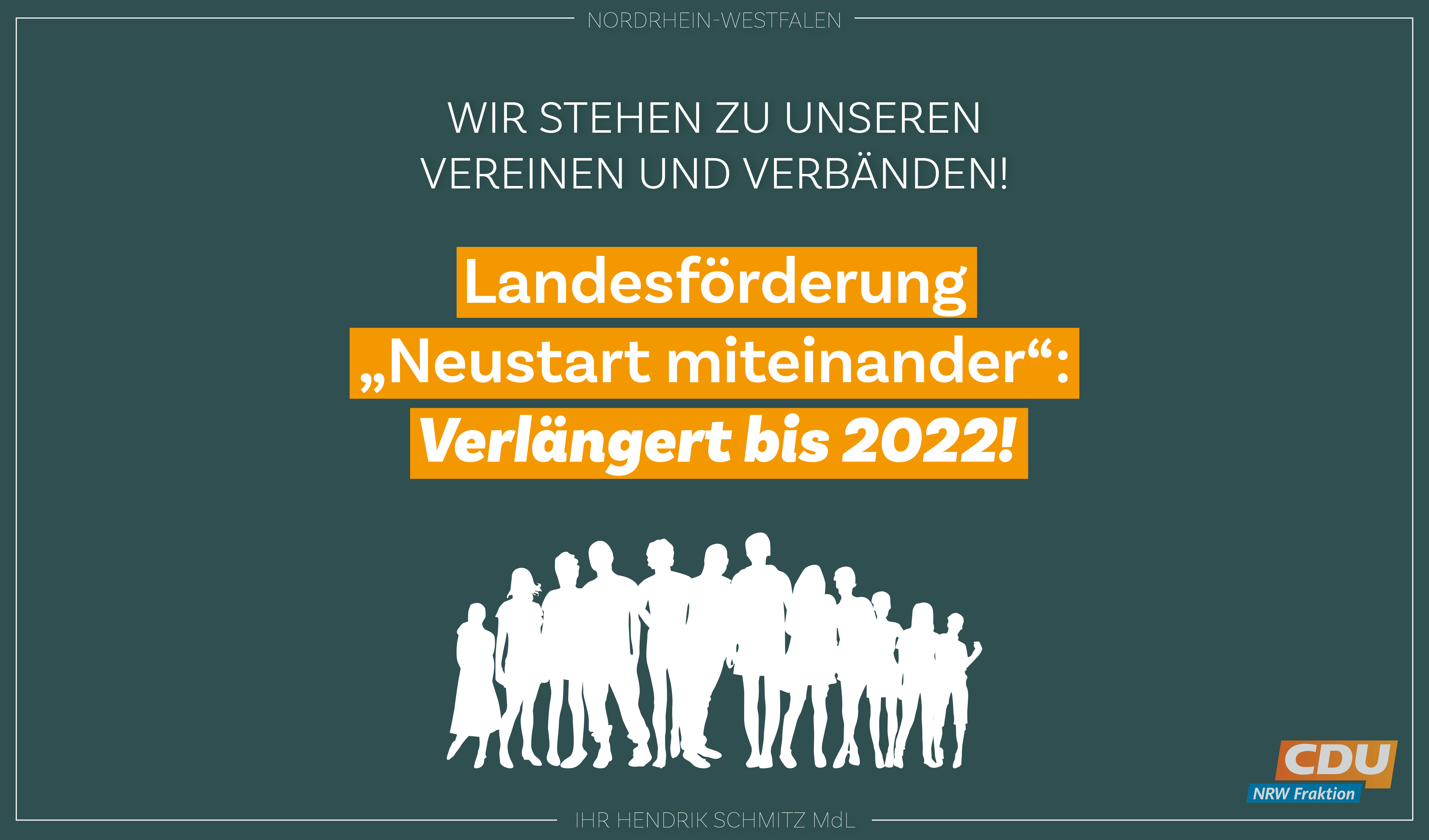 „Diese besondere Vereinshilfe wird bis Sommer 2022 verlängert“, erklärt Hendrik Schmitz, CDU-Landtagsabgeordneter für das Aachener Land: „Damit geht das Sonderprogramm ‚Neustart miteinander‘ für das Ehrenamt in eine weitere Runde!“